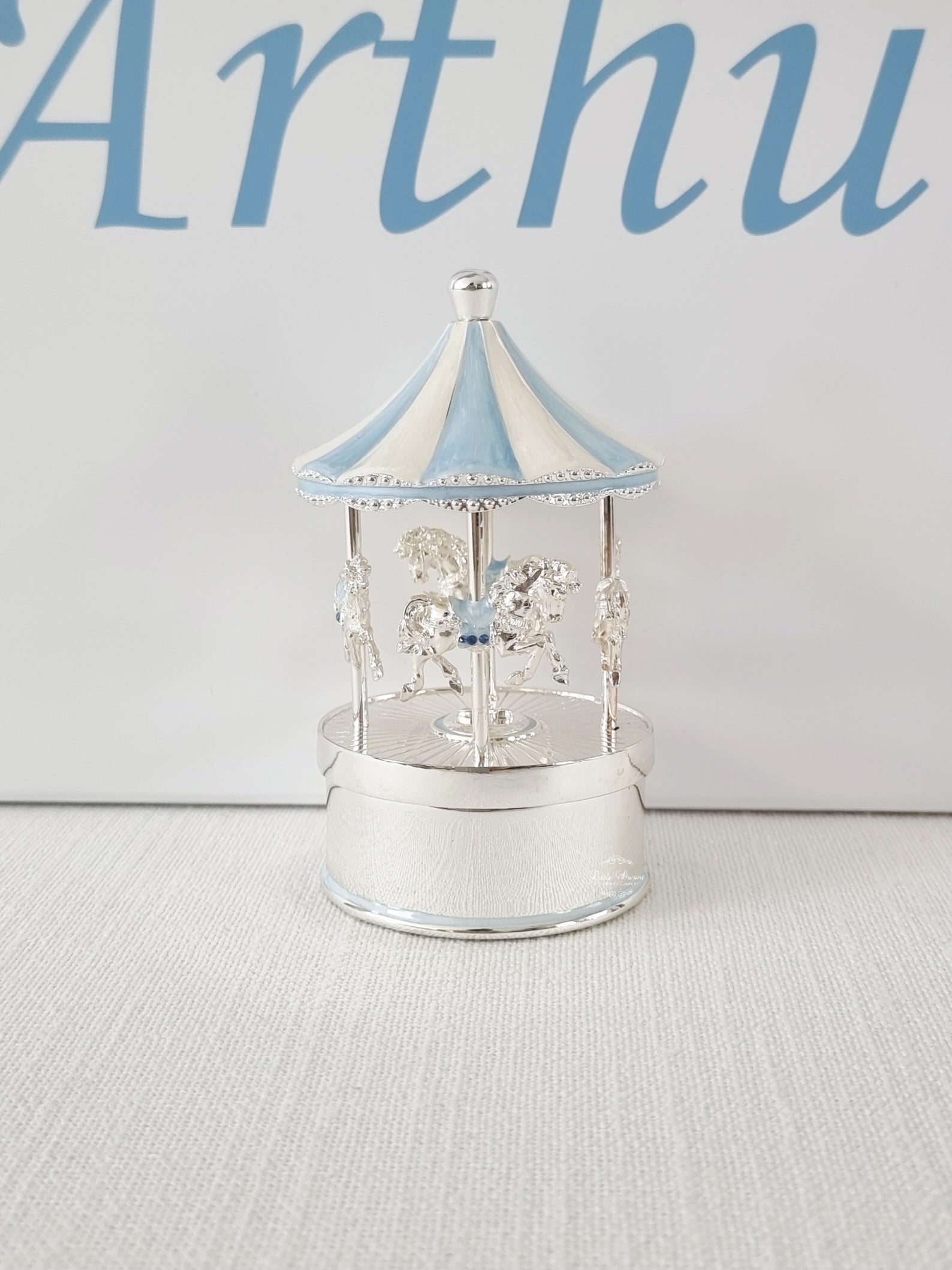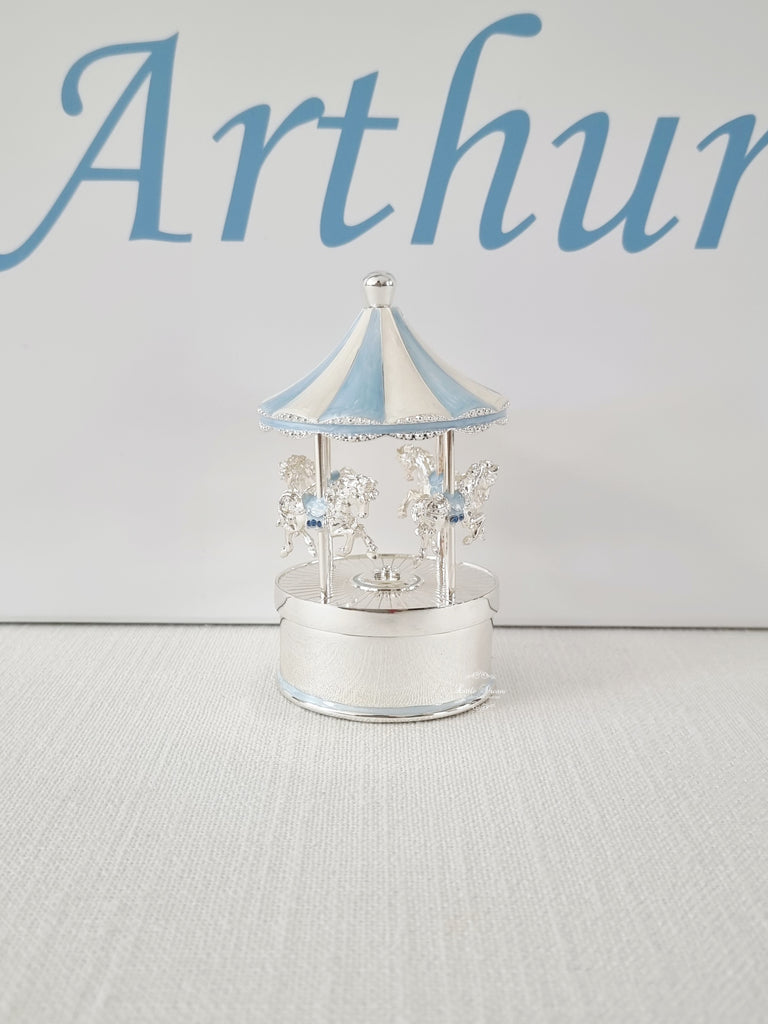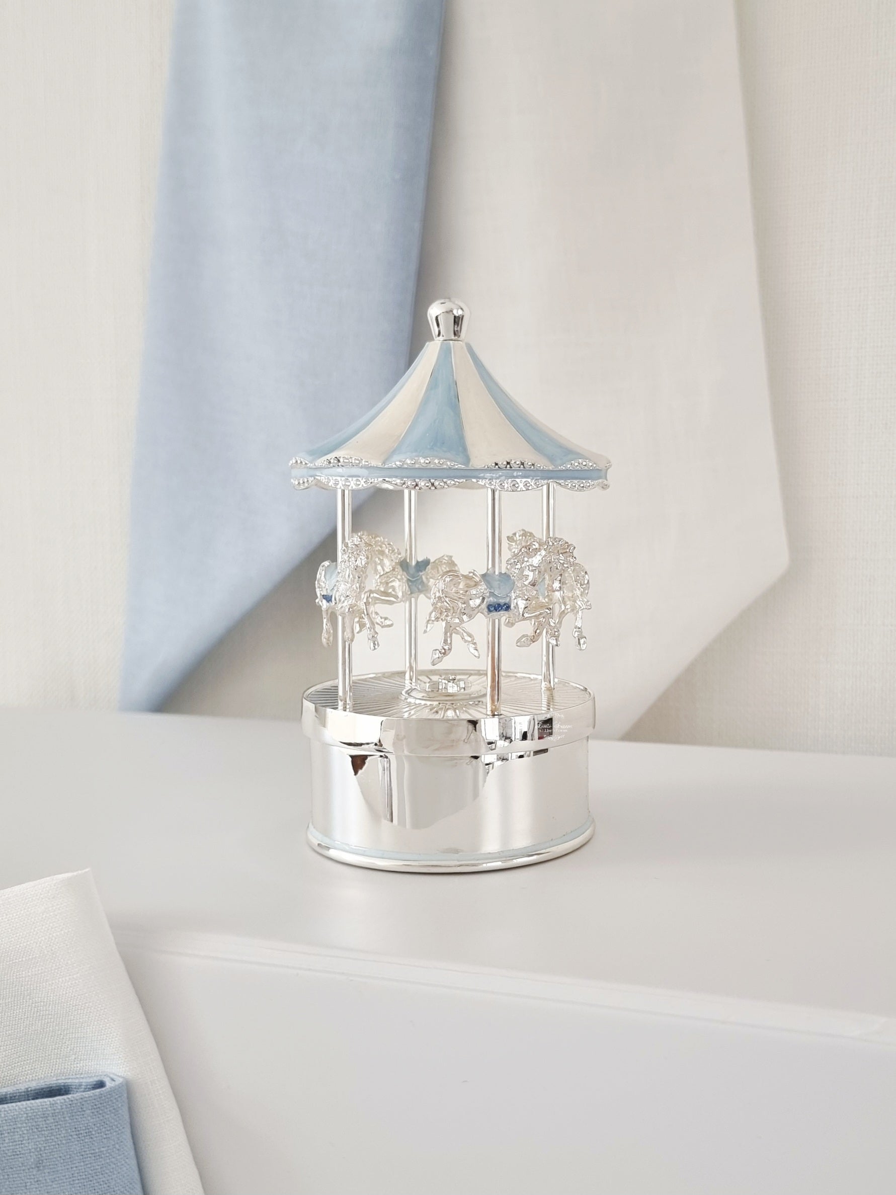 Shiny silver-plated with baby blue Rocking Horse Carousel This charming keepsake makes a perfect gift for a Newborn, Christening | Baptism, First Birthday, Christmas, or any special occasion.