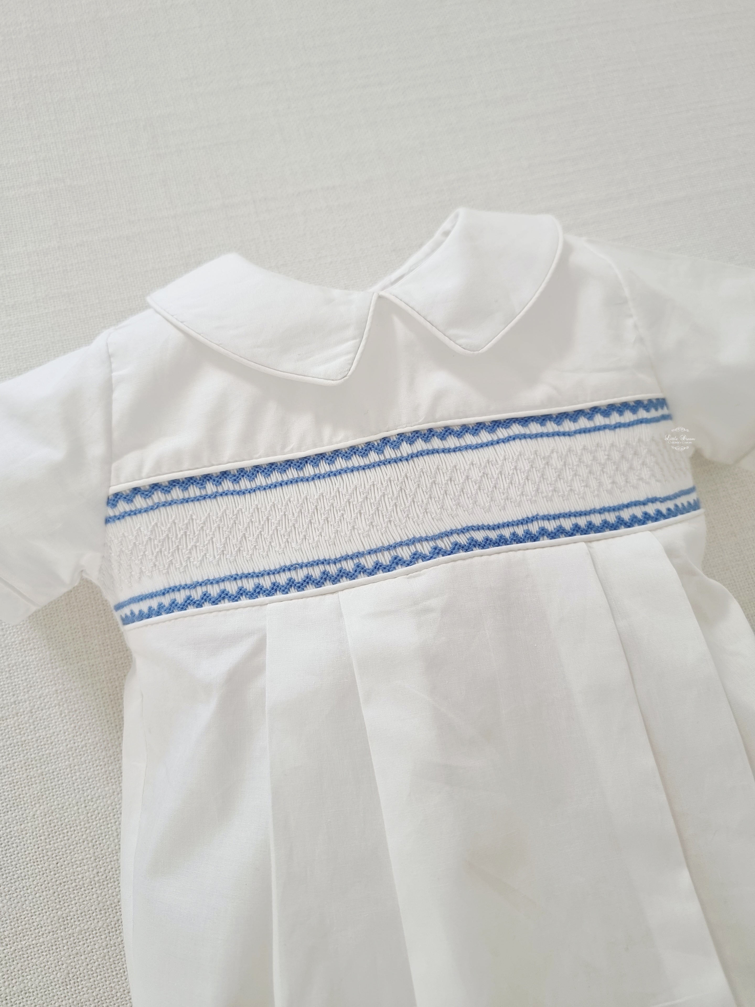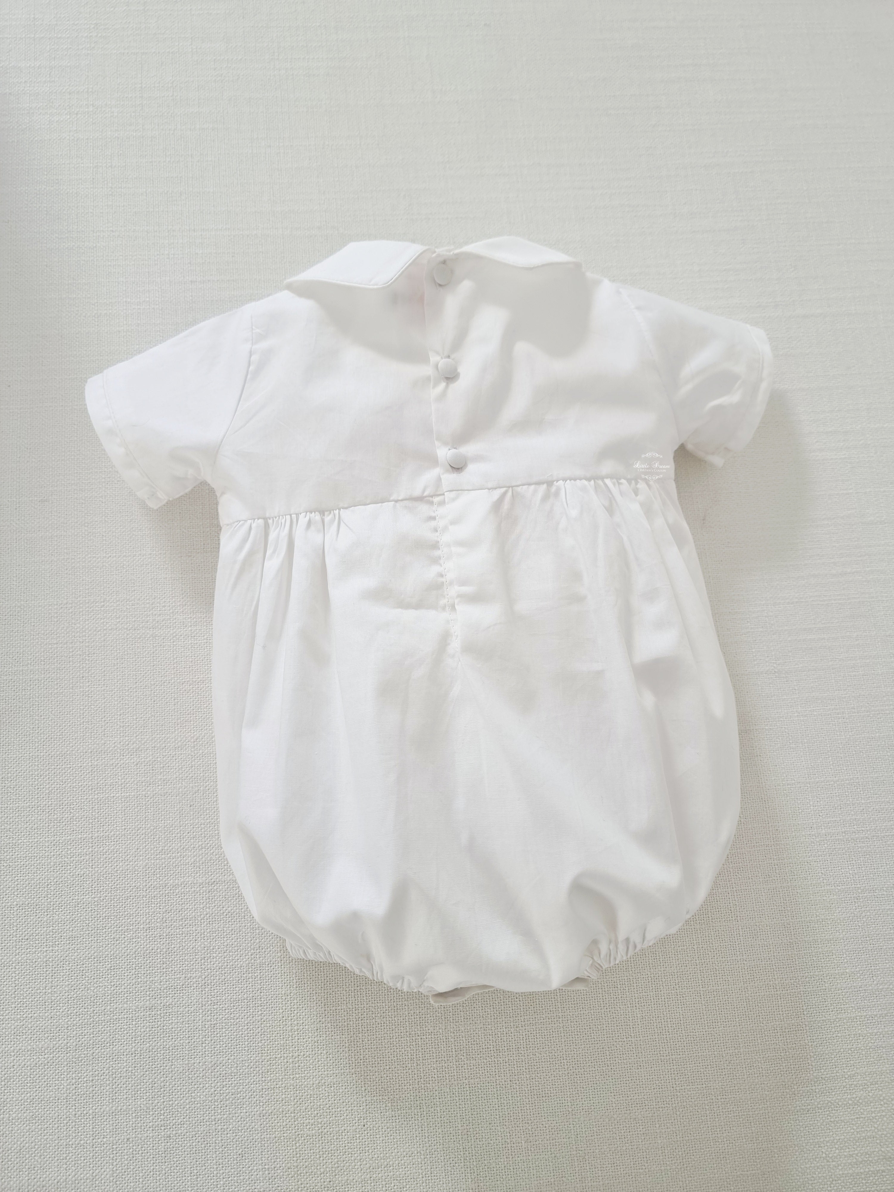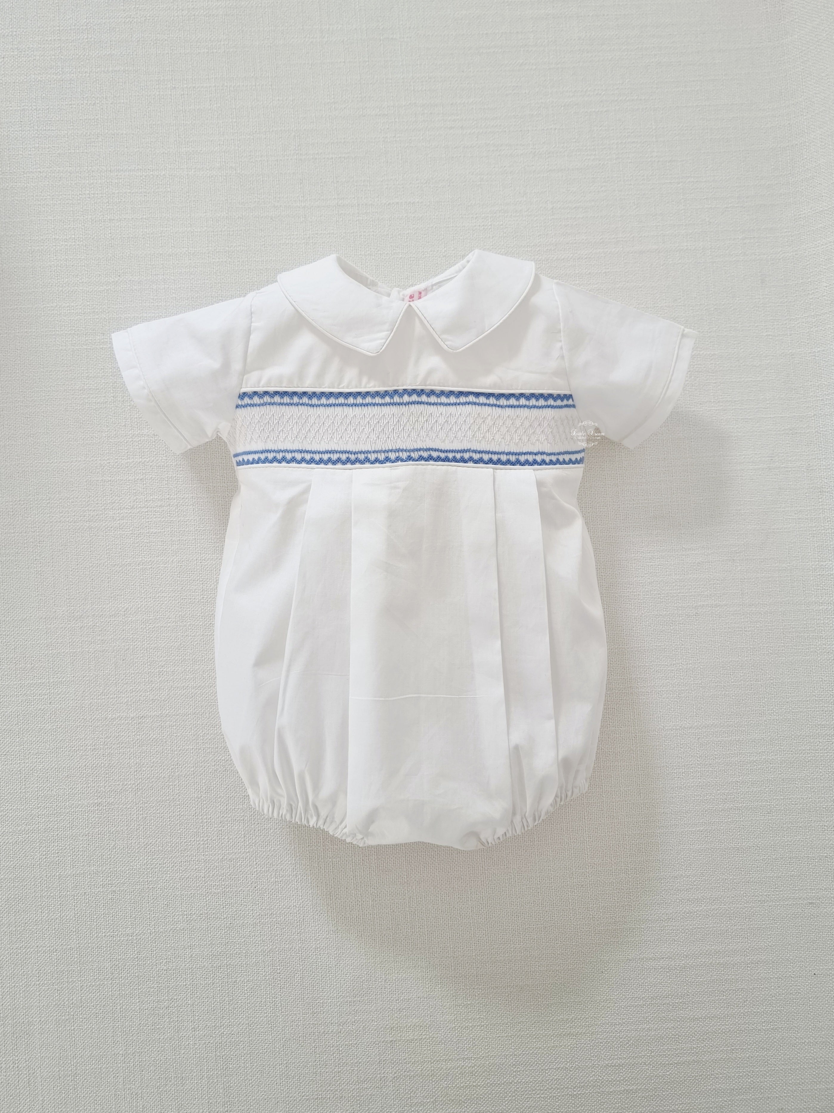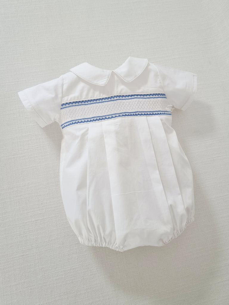 White delicate Cotton boys smocked romper with blue hand embroidery