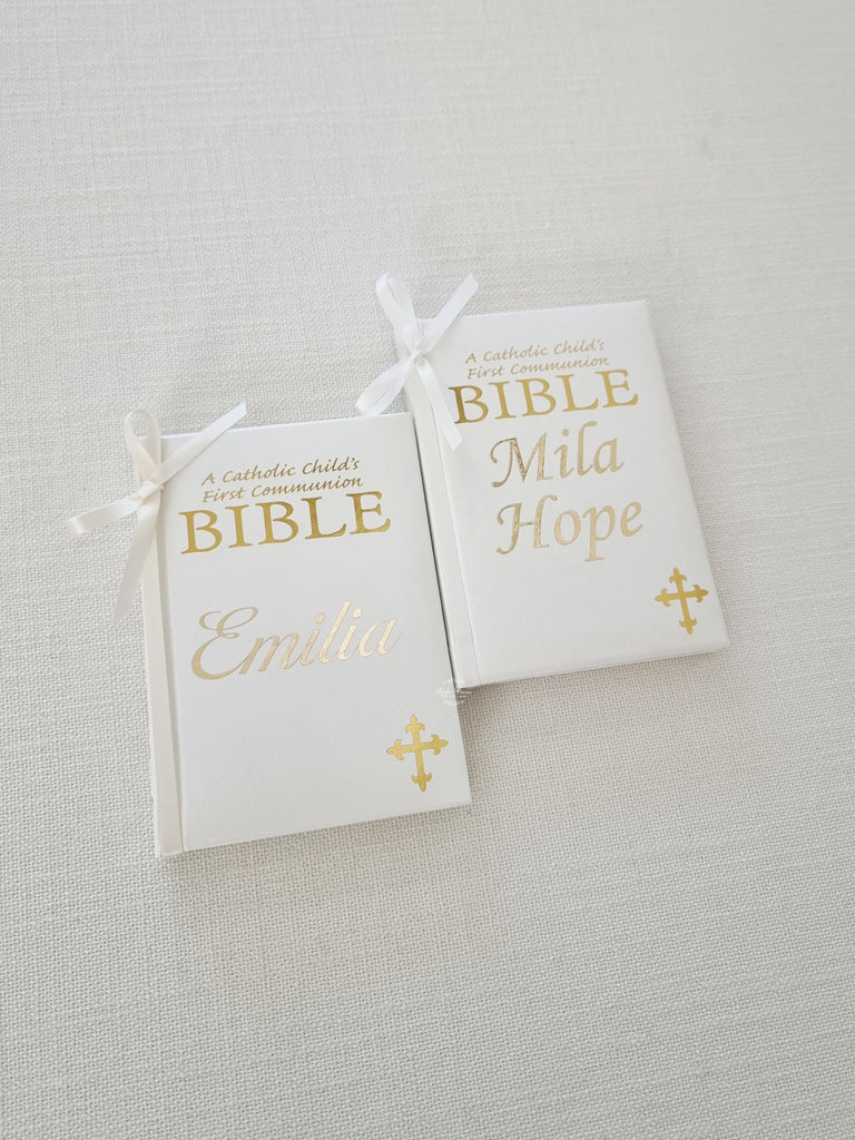 White padded cover with gold embossed lettering, gold gilt page edging with beautifully illustrated pages.