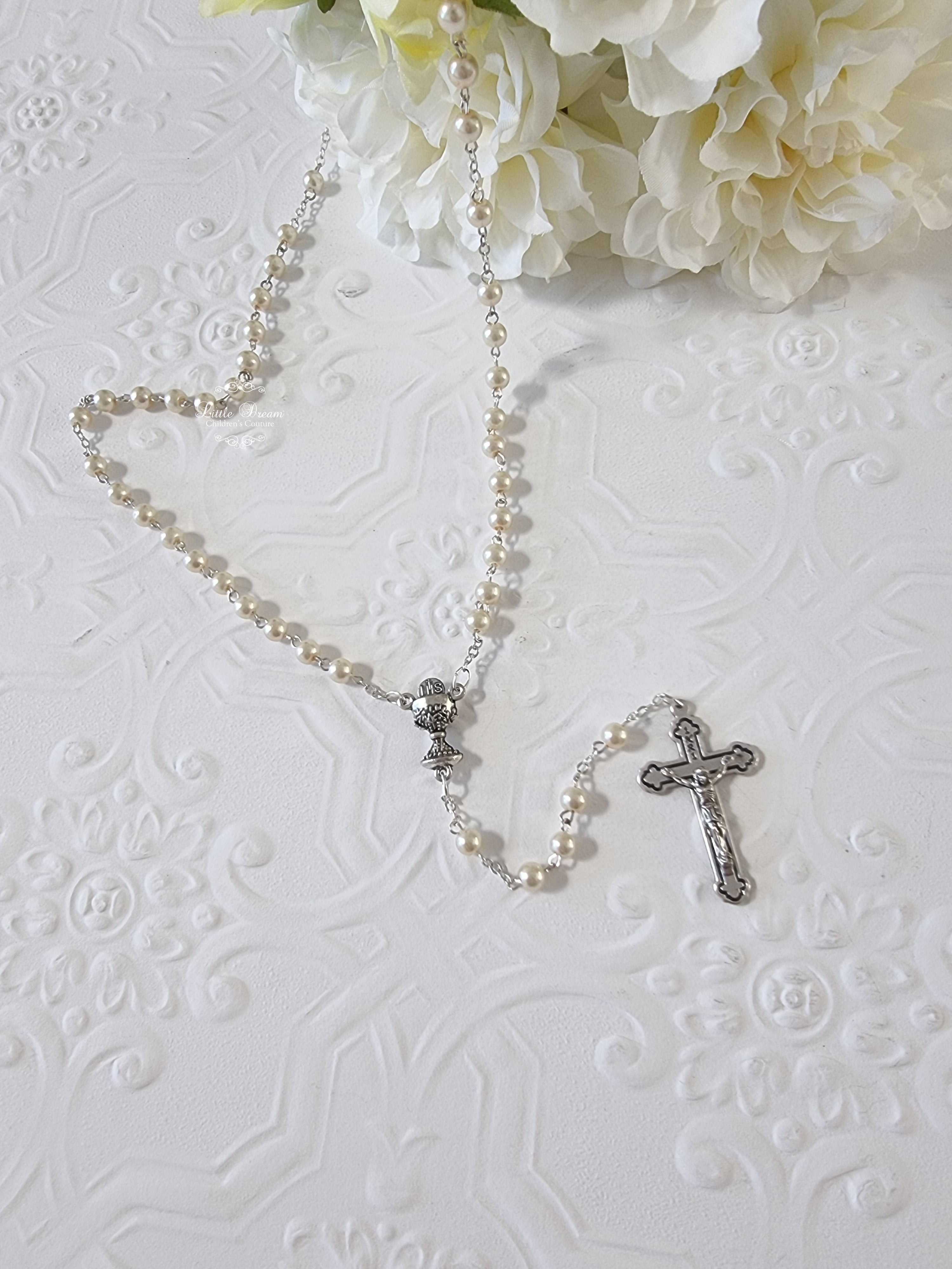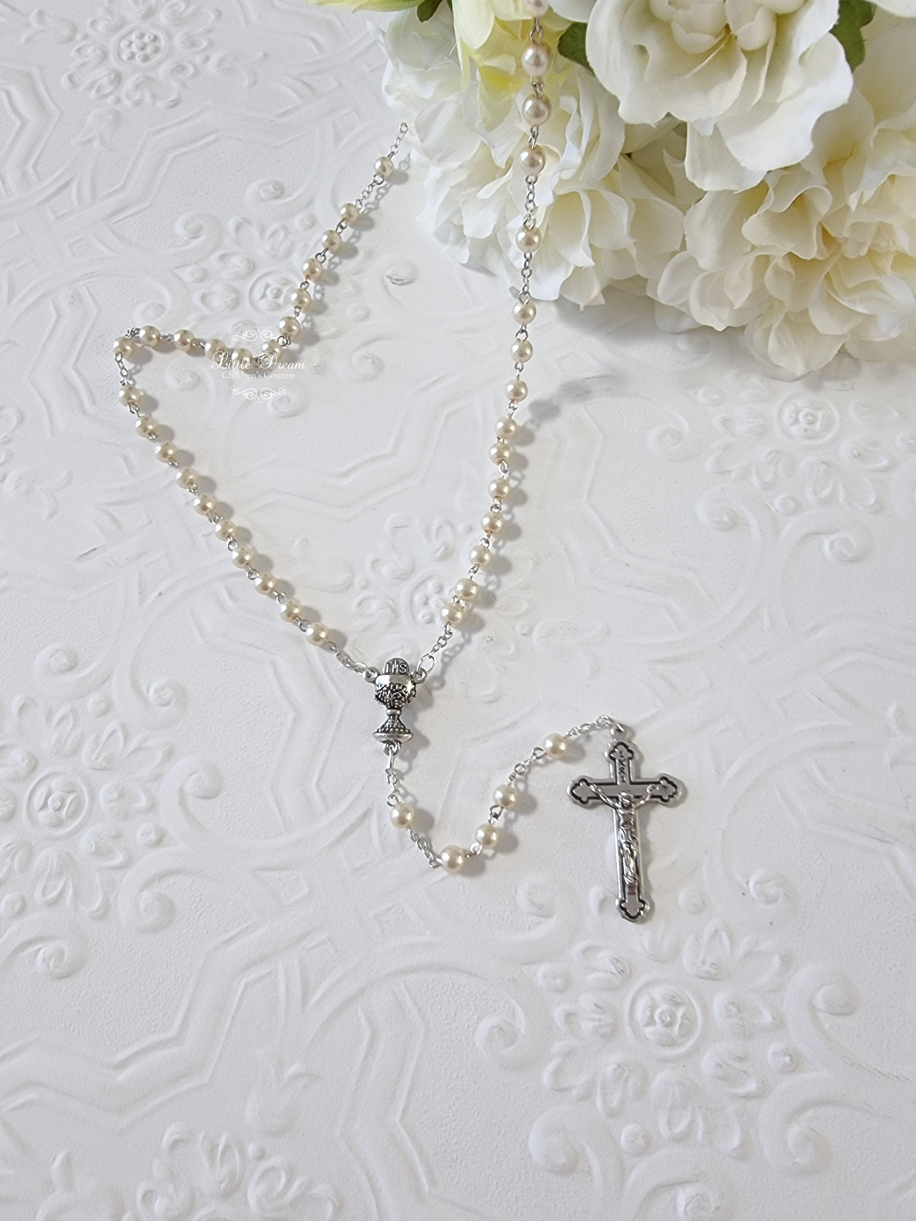 5mm Round Ivory Silver Chalice and Scalloped Edge Crucifix Rosary