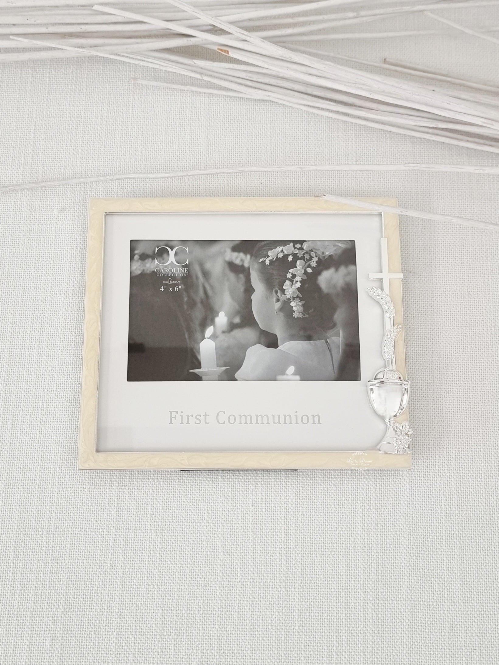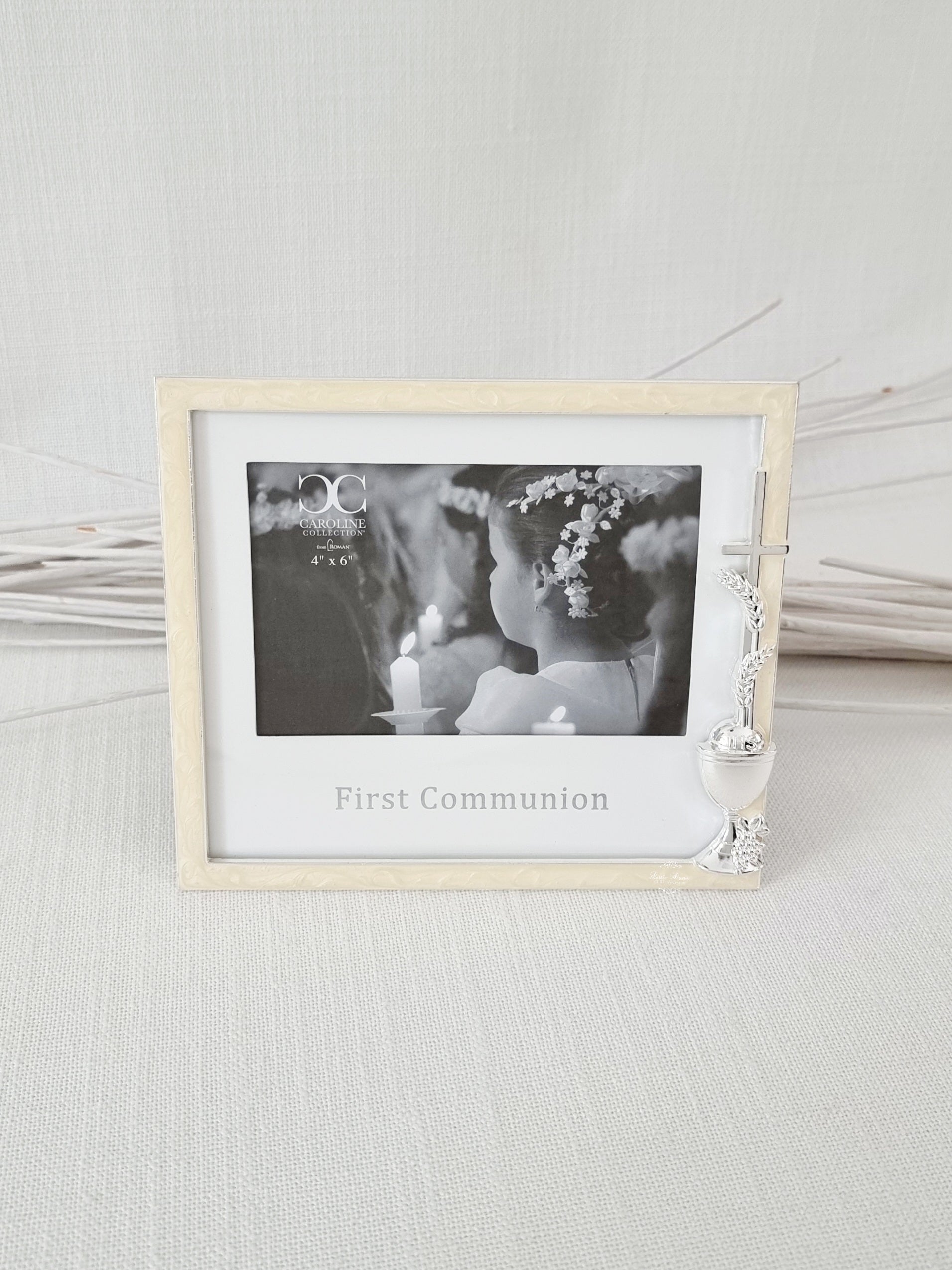 This beautifully made 'First Communion' photo frame is an ideal gift. Special detail commemorating this significant moment. This silver metal frame is surrounded with Ivory enamel and embellished with a raised "Chalice and silver Cross - Caroline Collection by Roman Inc