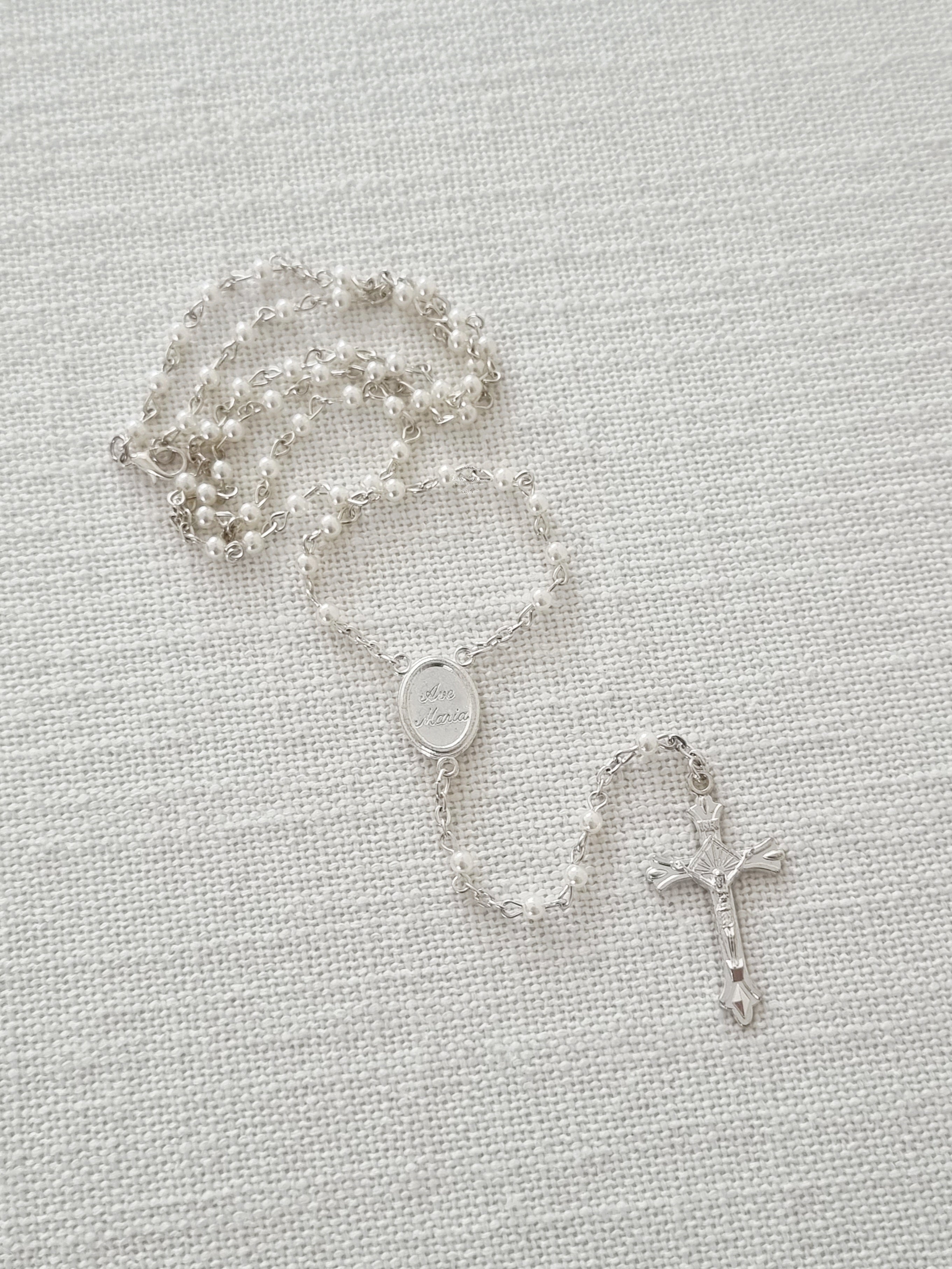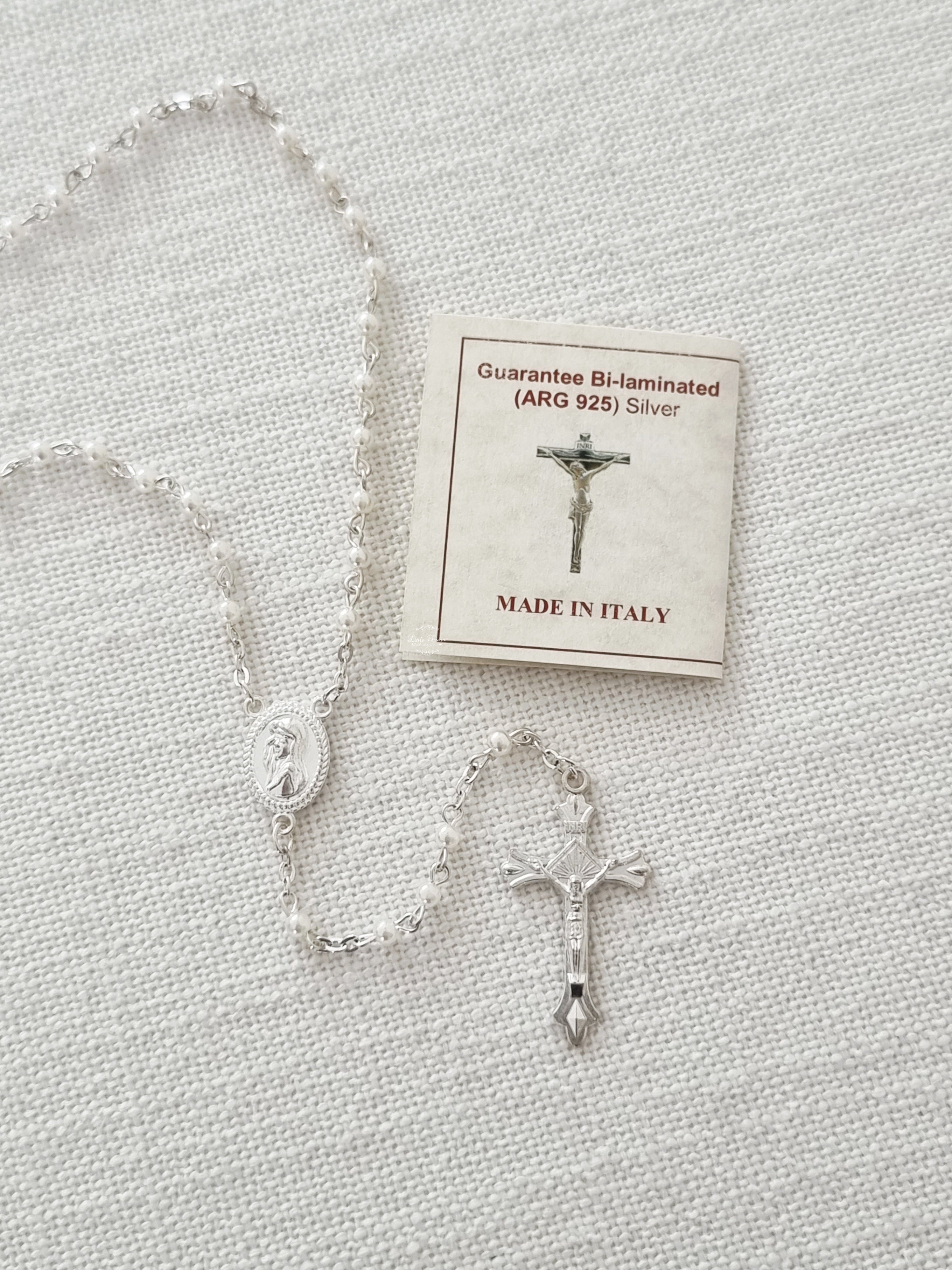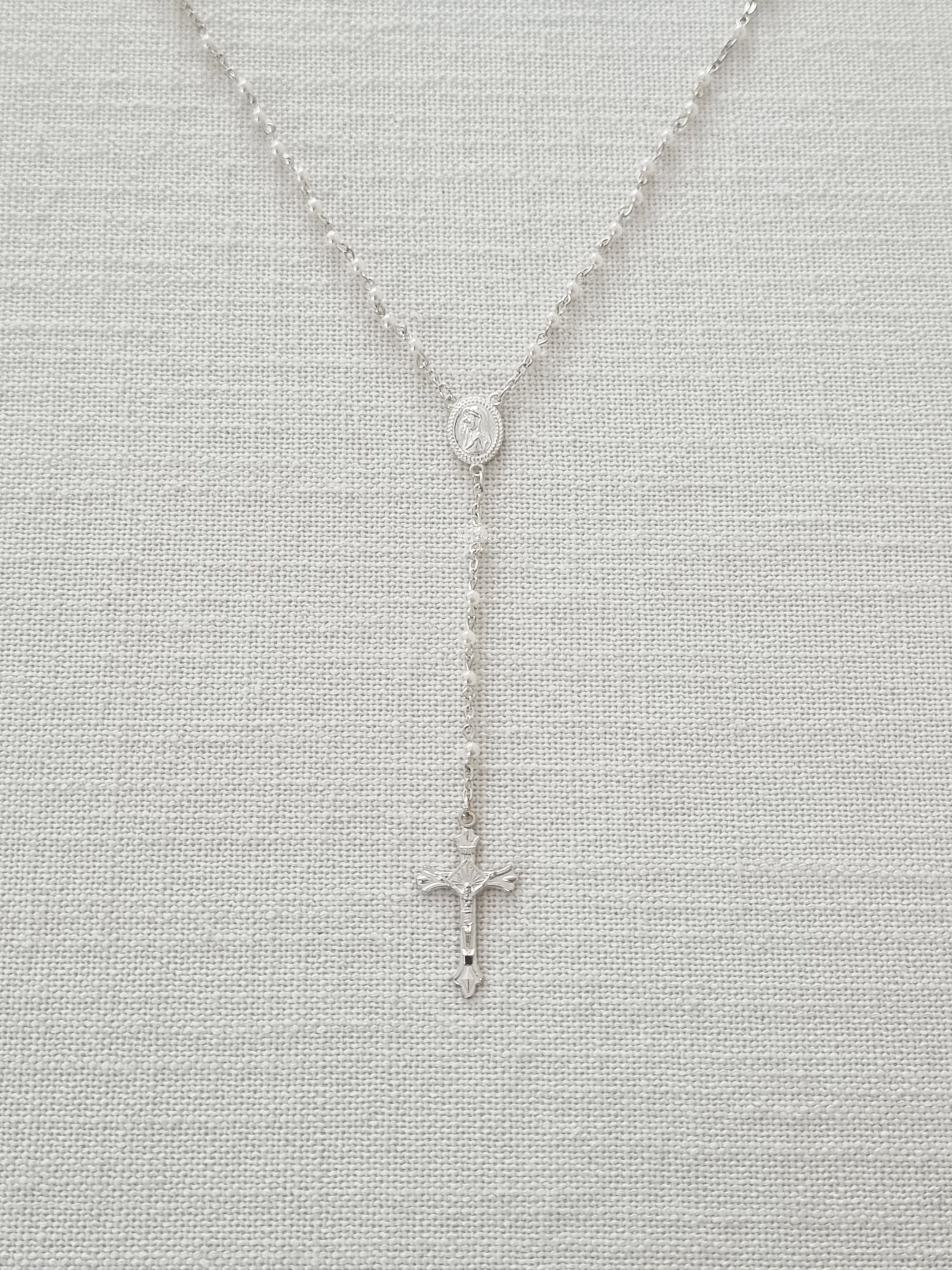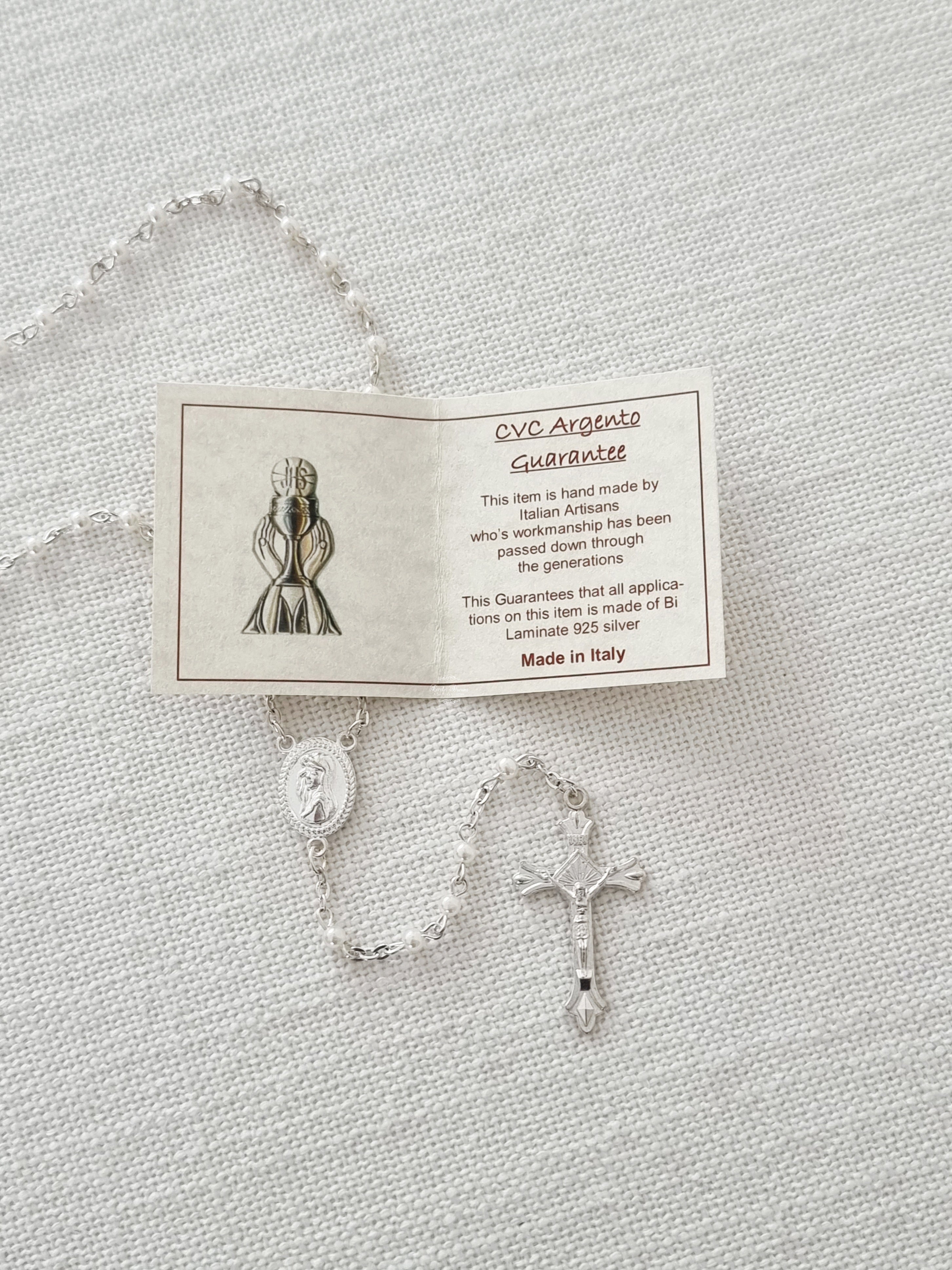 This Rosary has been hand-crafted by Italian artisans. It features 4mm round white glass beads and silver links made from Bi-Laminate 925 silver. The design is completed with a detailed Crucifix, a Hail Holy Queen centre piece, and a secure parrot clasp.