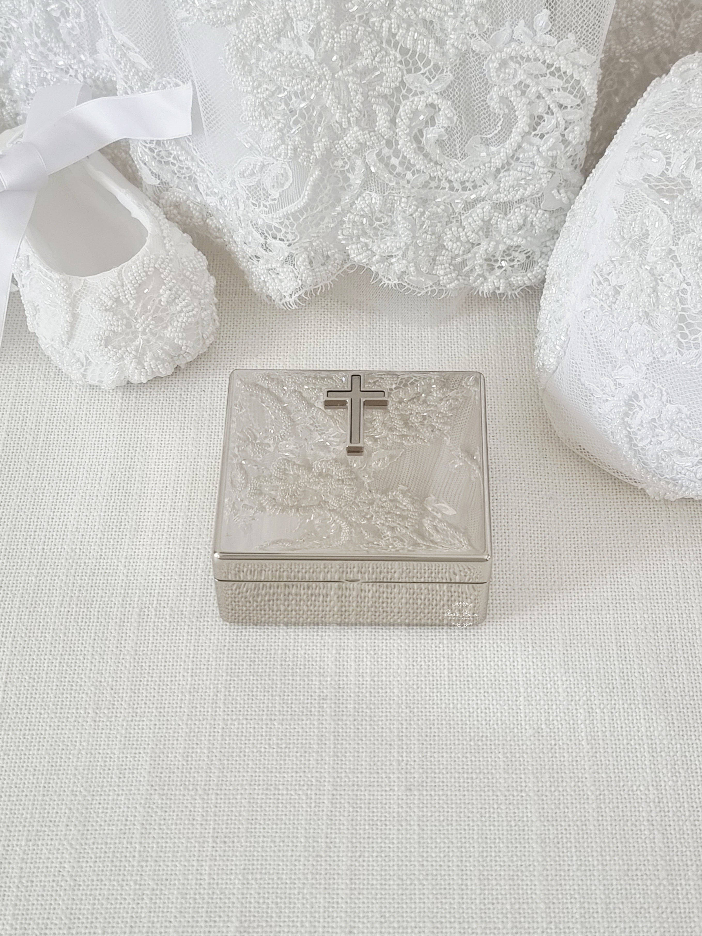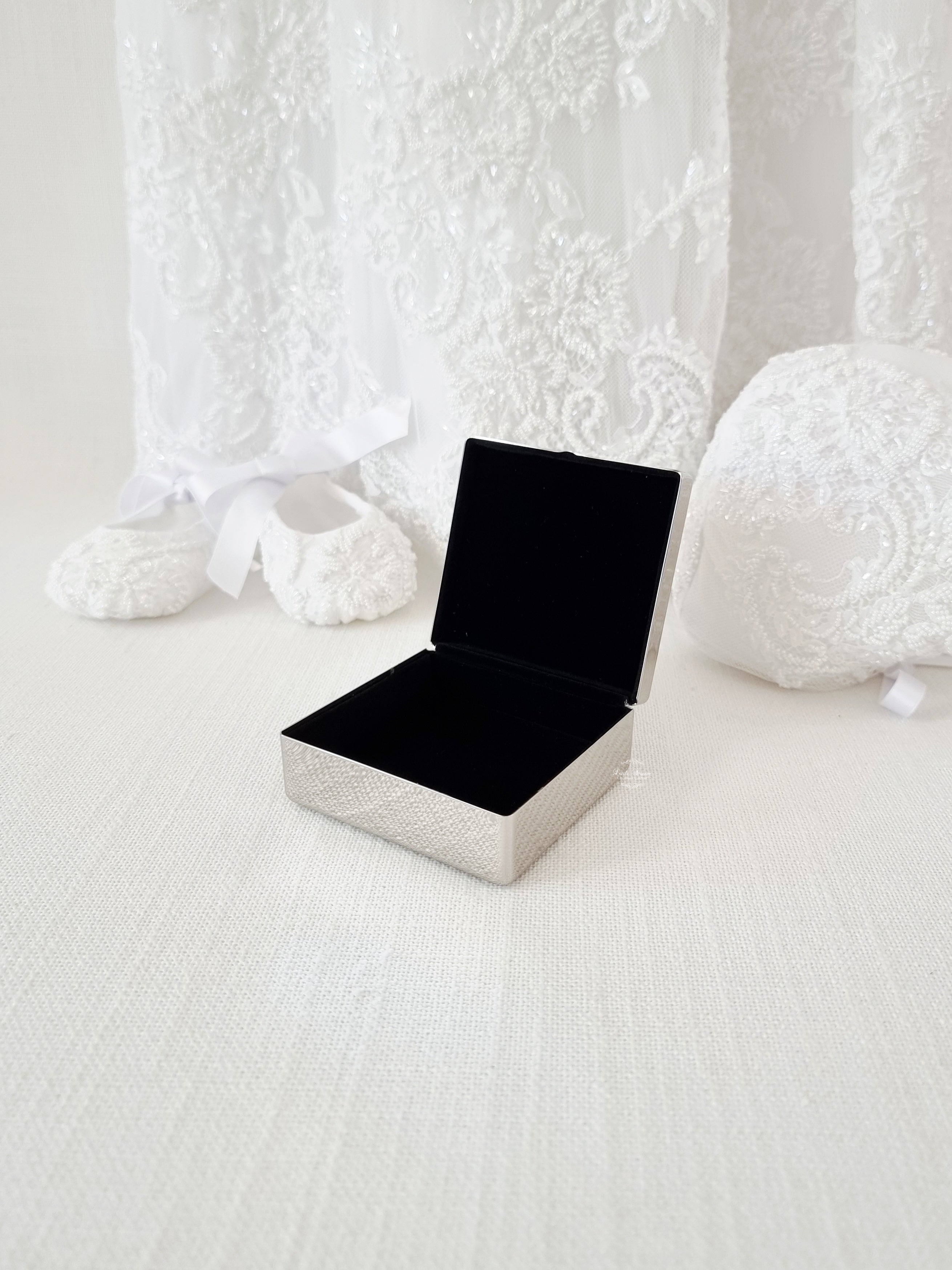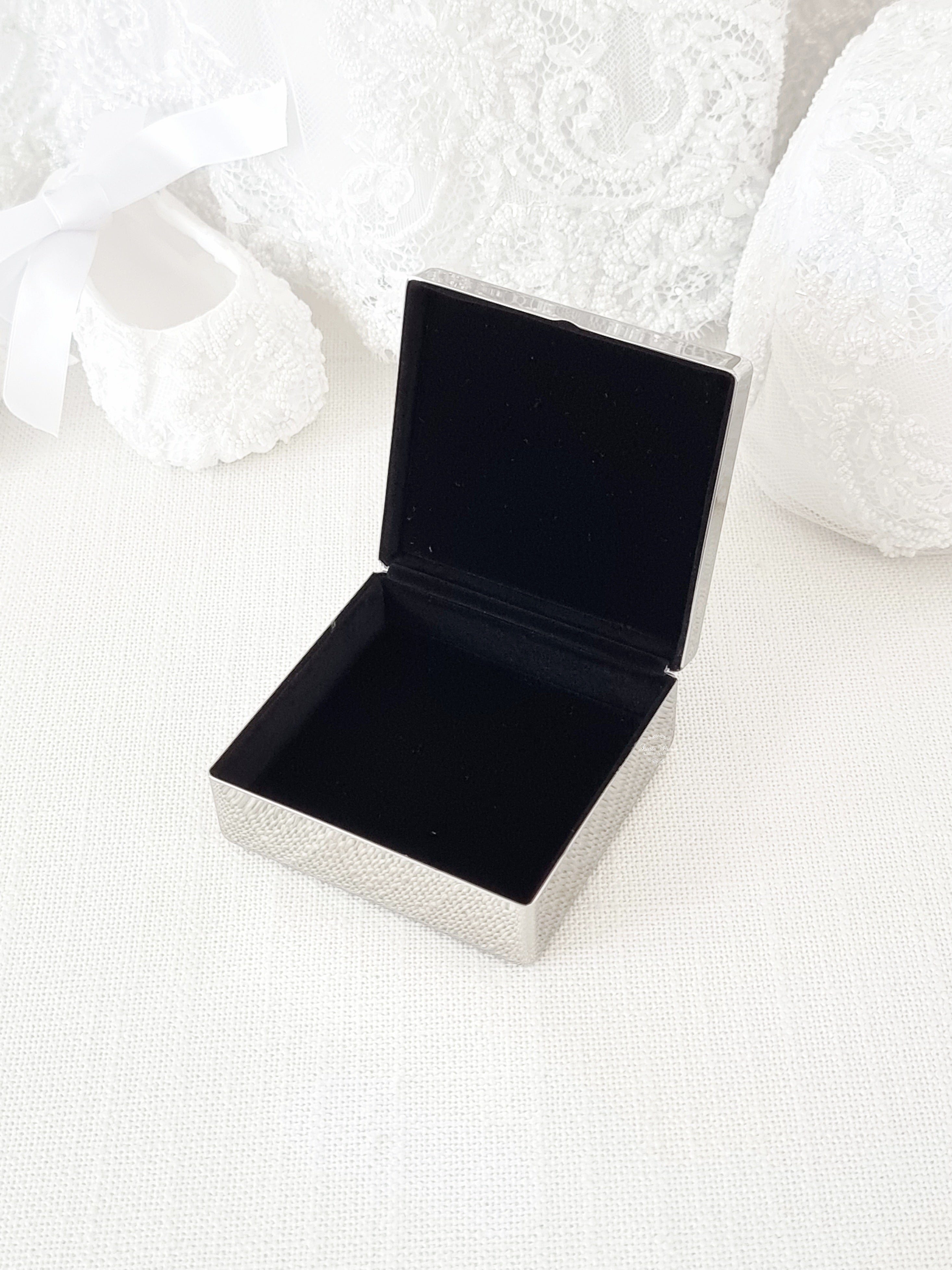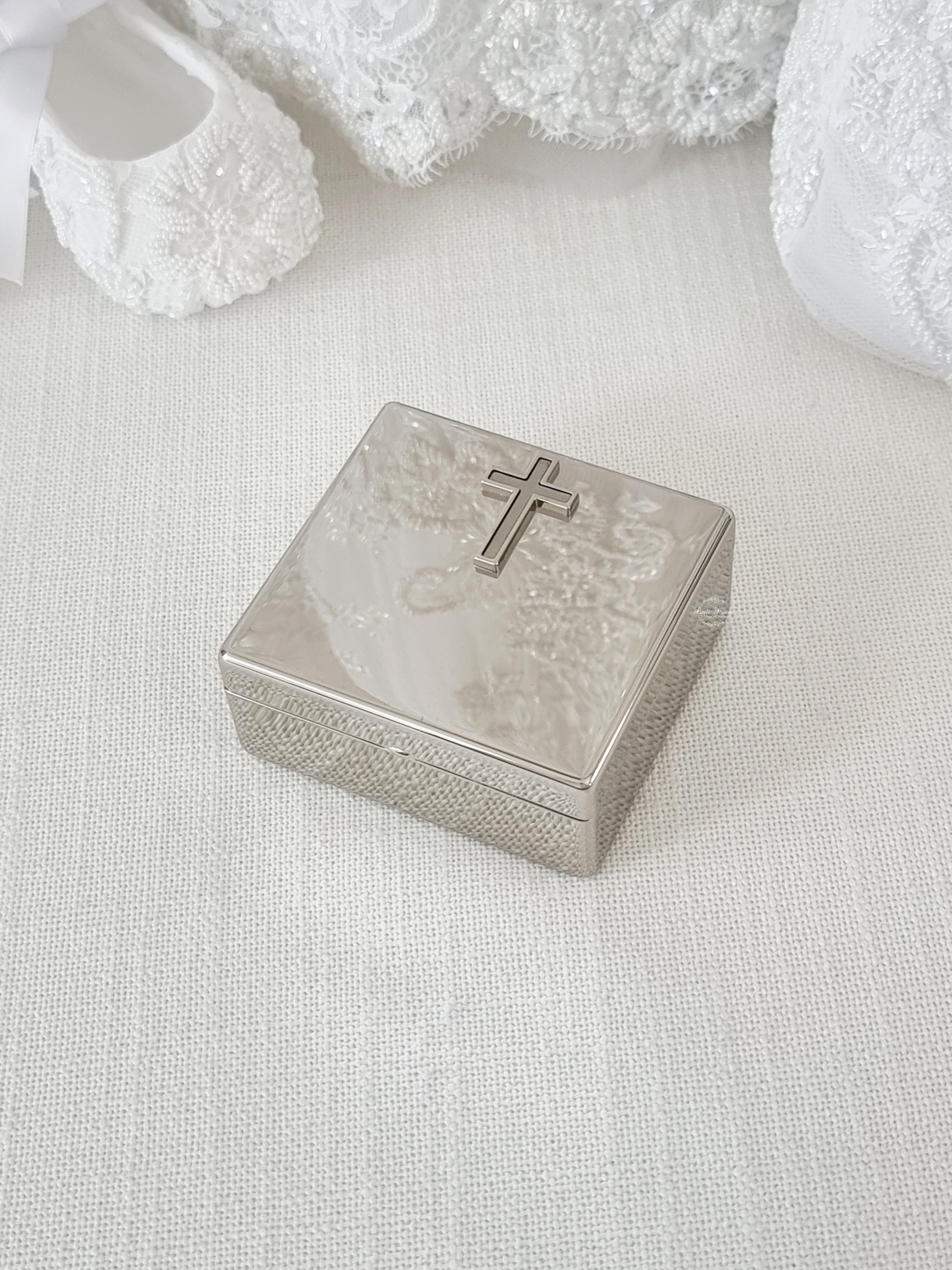 By Whitehill raised Cross silver square plain metal design Jewellery keepsake box designed for storing items like a Rosary, jewellery or small keepsakes, it includes a felt lined interior and is an excellent choice for a gift.